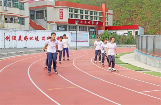 在泉州市奕聪中学的轮滑场内,学生们正在进行每周两次的训练。双腿弯曲蹬地,身体略向前倾,配合手杖的推动,他们在平地飞快滑行,奋力争先,尽情地体验夏日“越野滑雪”的乐趣。